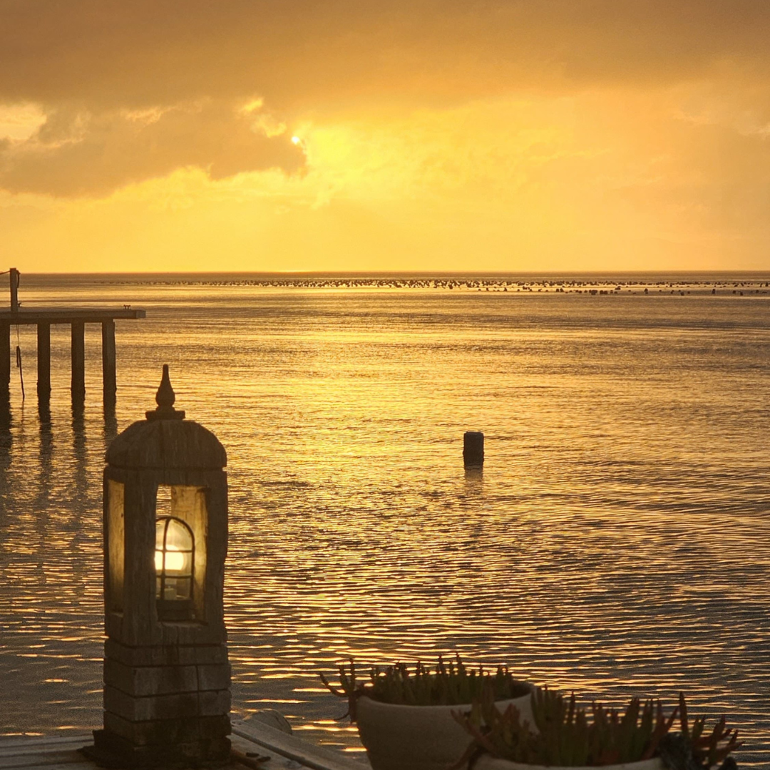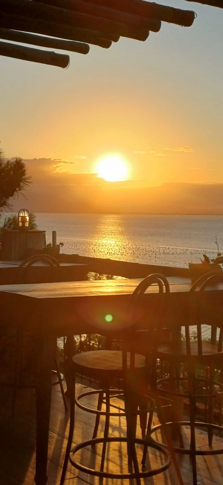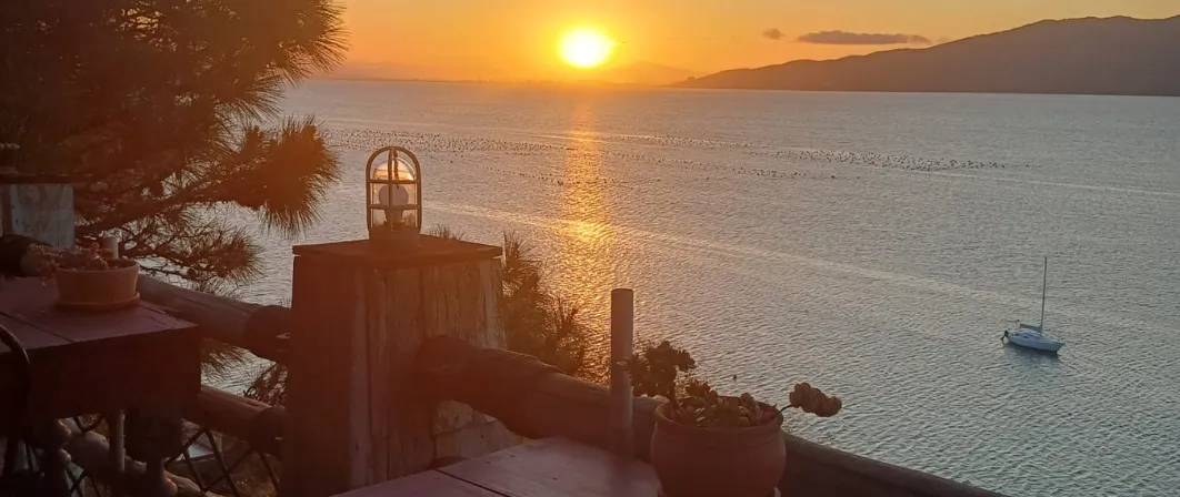 ● DECK CONTEMPLATIVO FRONTAL À BAÍA DE ZIMBROS, COM CADEIRAS E ESPREGUIÇADEIRAS